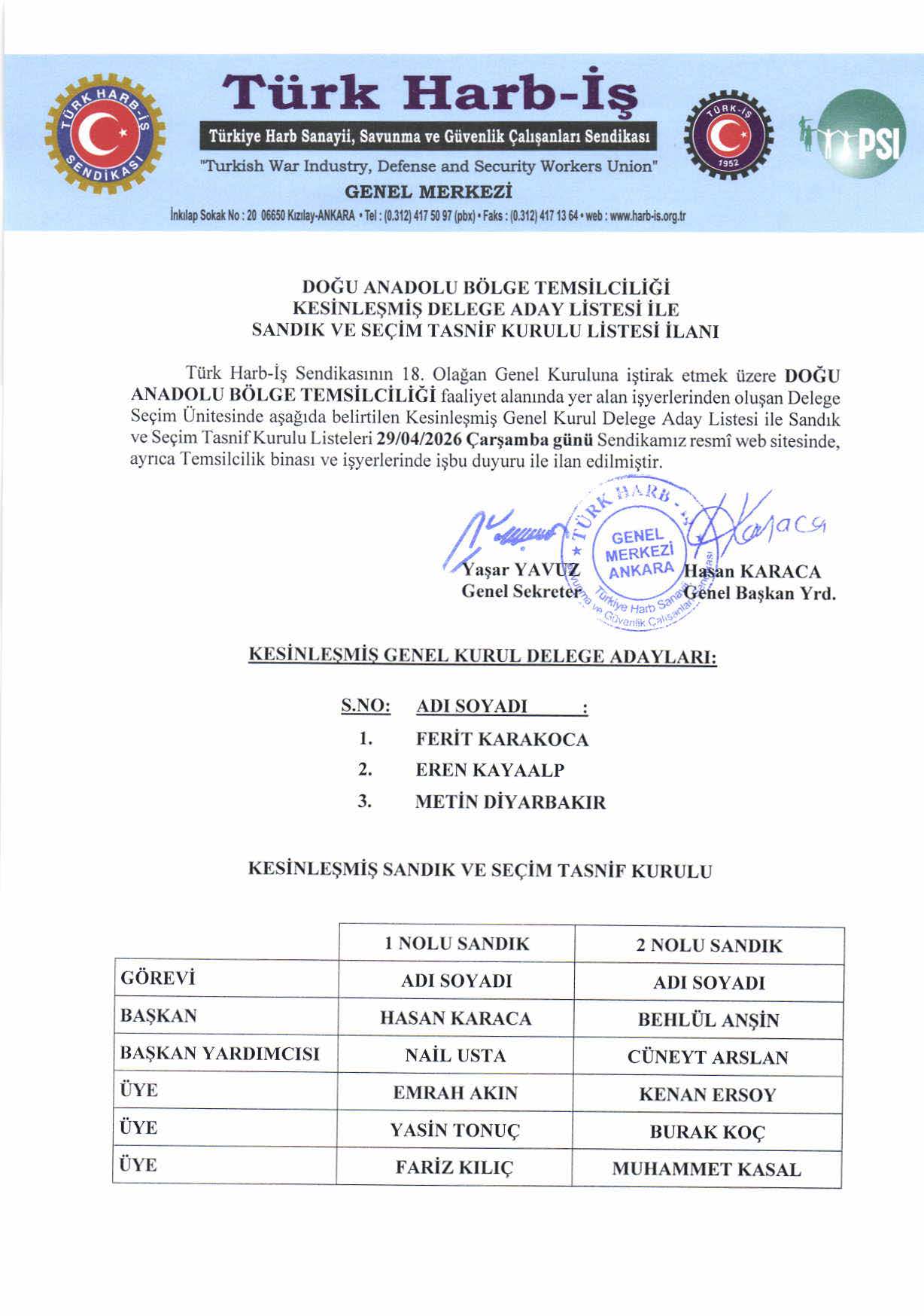 DAB KESİNLEŞMİŞ DELEGE ADAY LİSTESİ İLE SANDIK VE SEÇİM TASNİF KURULU İLANI-1