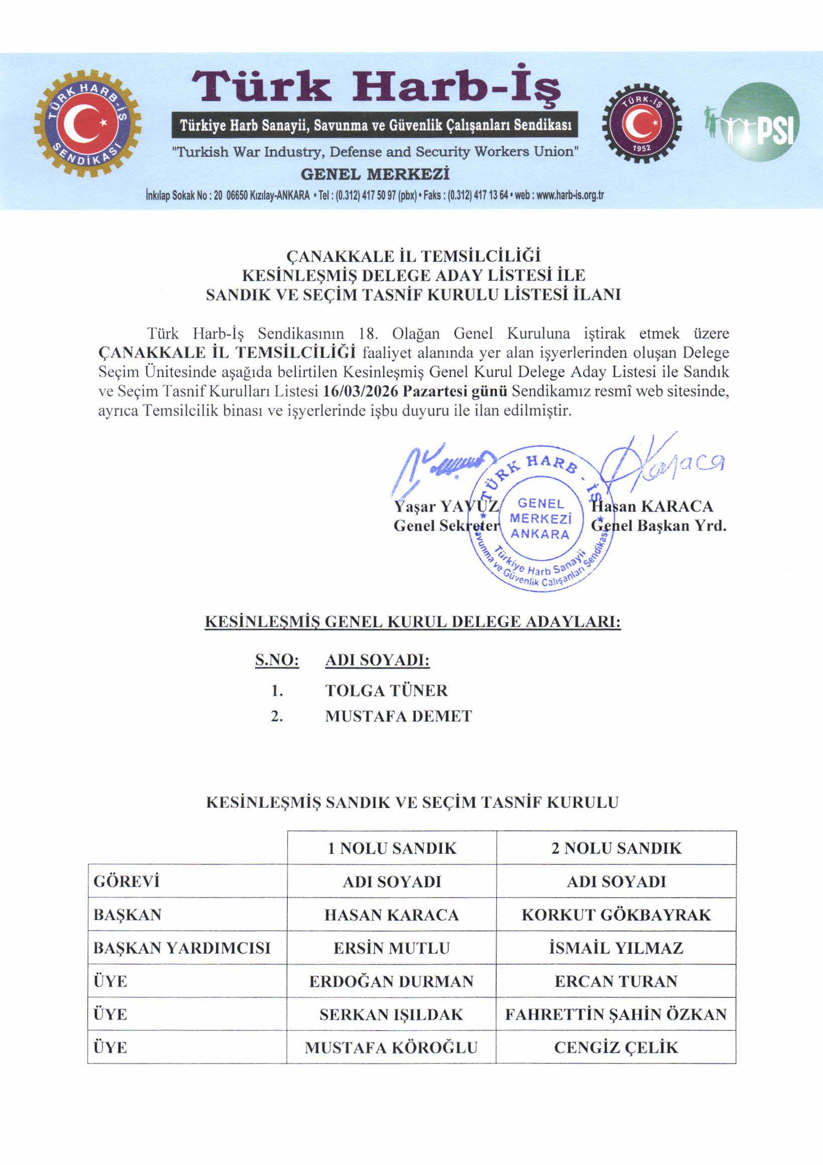 1. İLAN ÇANAKKALE İL TEMSİLCİLİĞİ KESİNLEŞMİŞ DELEGE ADAY LİSTESİ İLE SANDIK VE SEÇİM TASNİF KURULU LİSTESİ İLANI