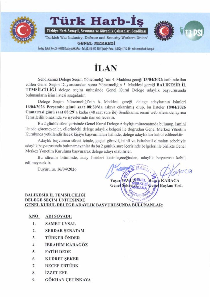 BALIKESİR İL TEMSİLCİLİĞİ GENEL KURUL DELEGE ADAY LİSTESİ İLANI
