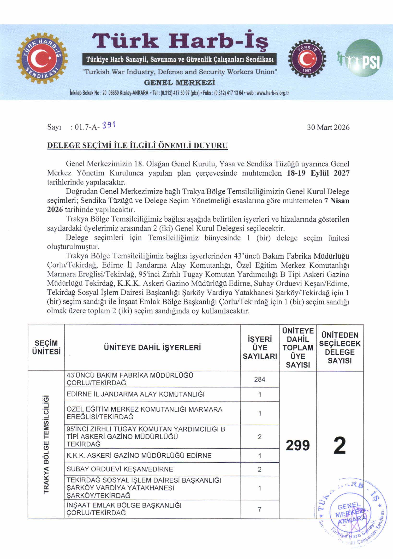 TRAKYA BÖLGE TEMSİLCİLİĞİ GENEL KURUL DELEGE SEÇİMLERİ İLE İLGİLİ İLAN