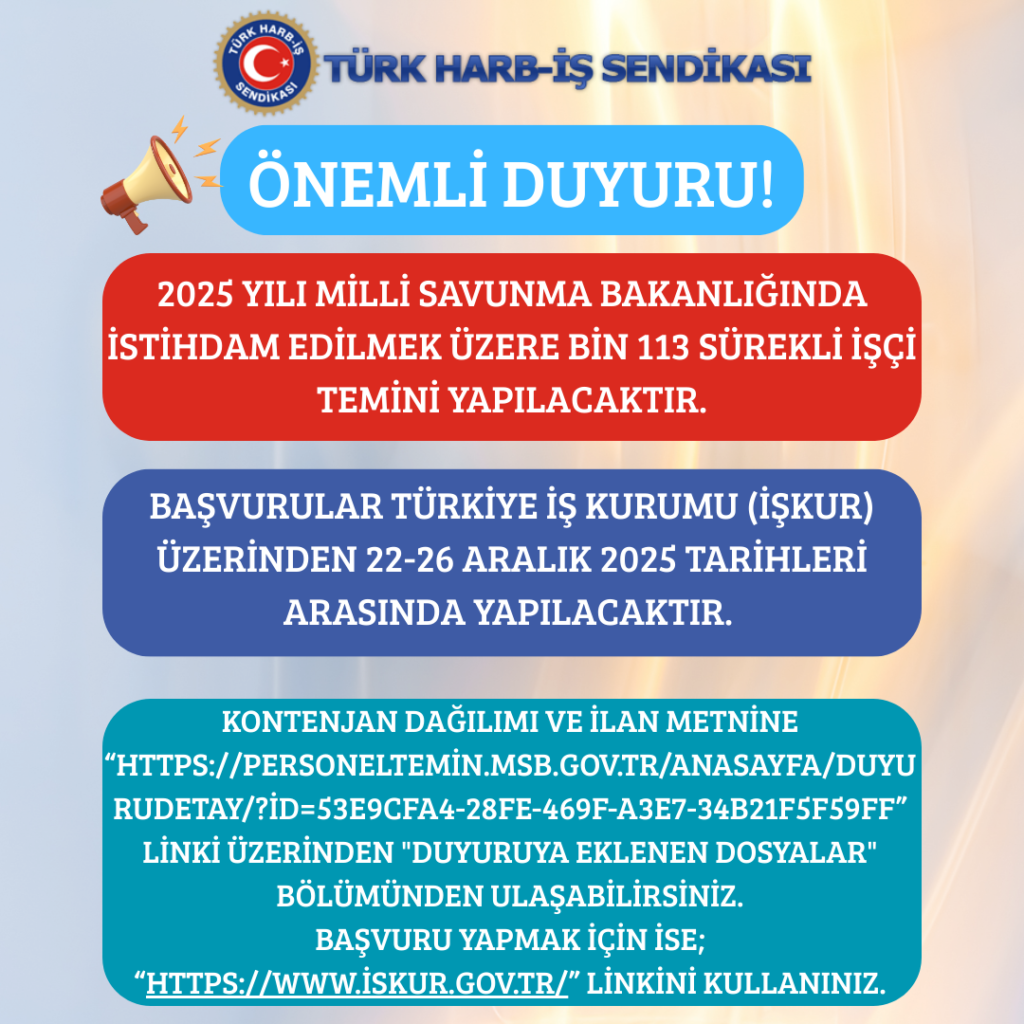 2025 Yılı Milli Savunma Bakanlığında istihdam edilmek üzere bin 113 sürekli işçi temini yapılacaktır.