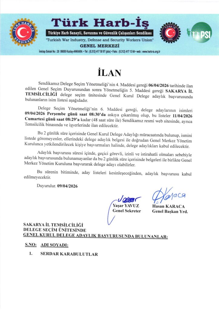 SAKARYA İL TEMSİLCİLİĞİ GENEL KURUL DELEGE ADAY LİSTESİ İLANI