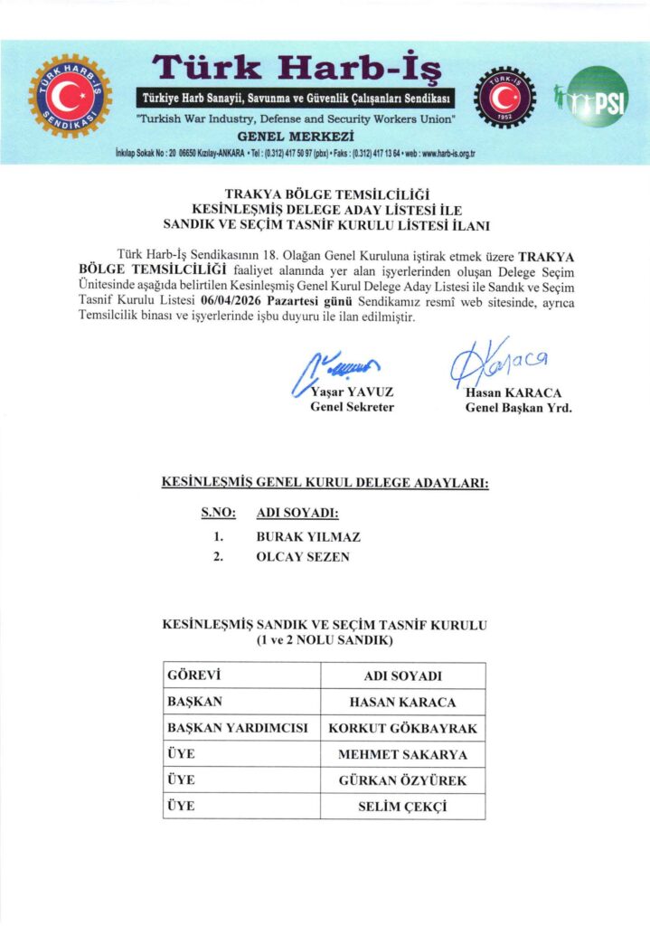 TRAKYA BÖLGE TEMSİLCİLİĞİ KESİNLEŞMİŞ DELEGE ADAY LİSTESİ İLE SANDIK VE SEÇİM TASNİF KURULU LİSTESİ İLANI