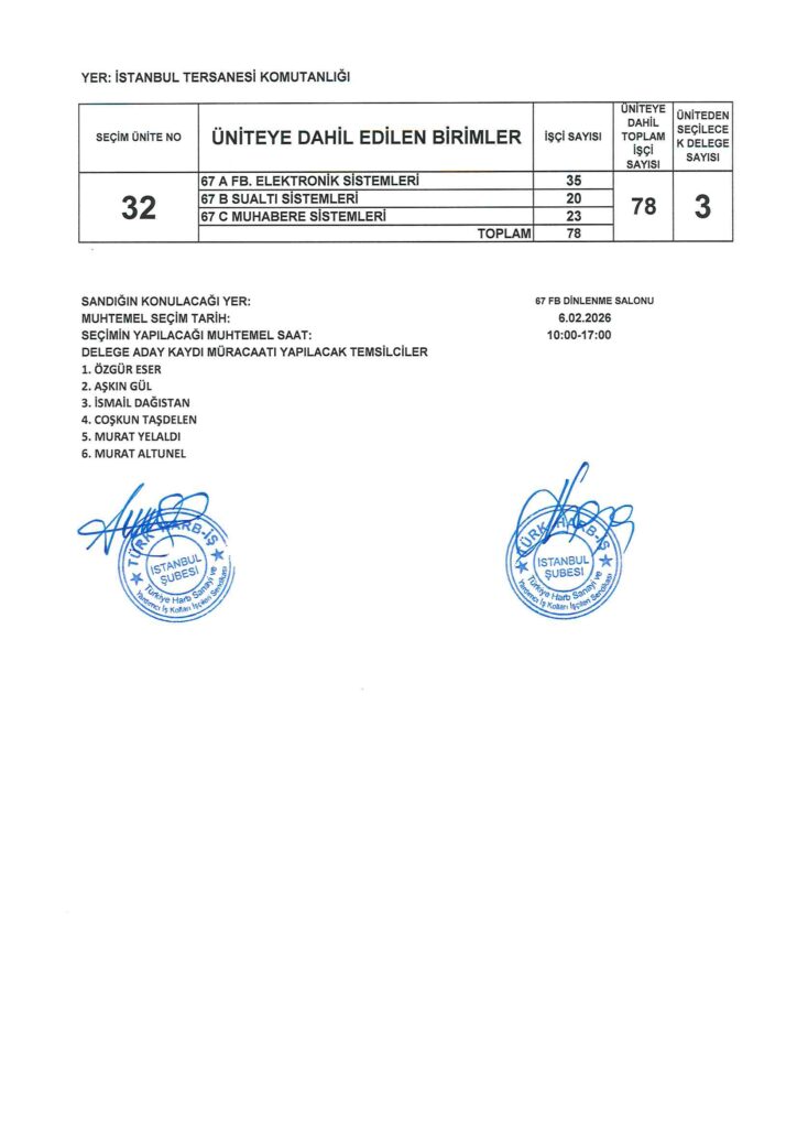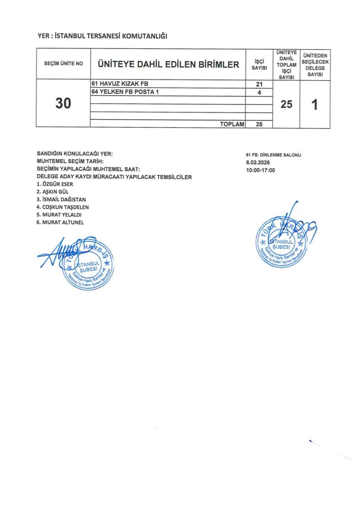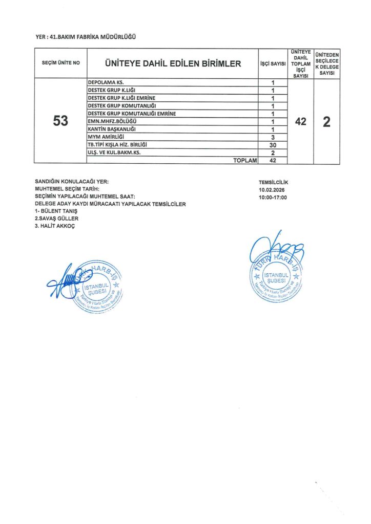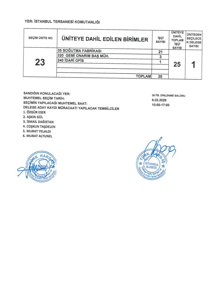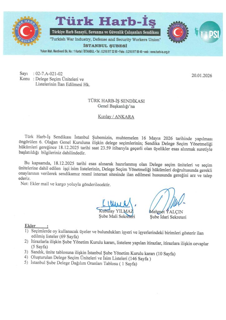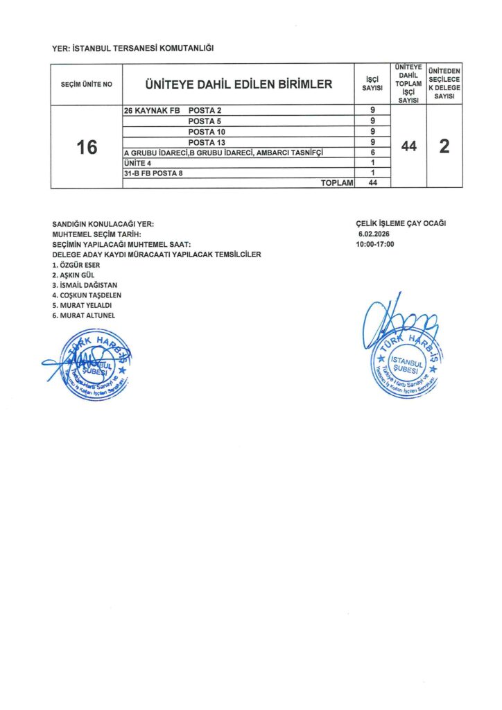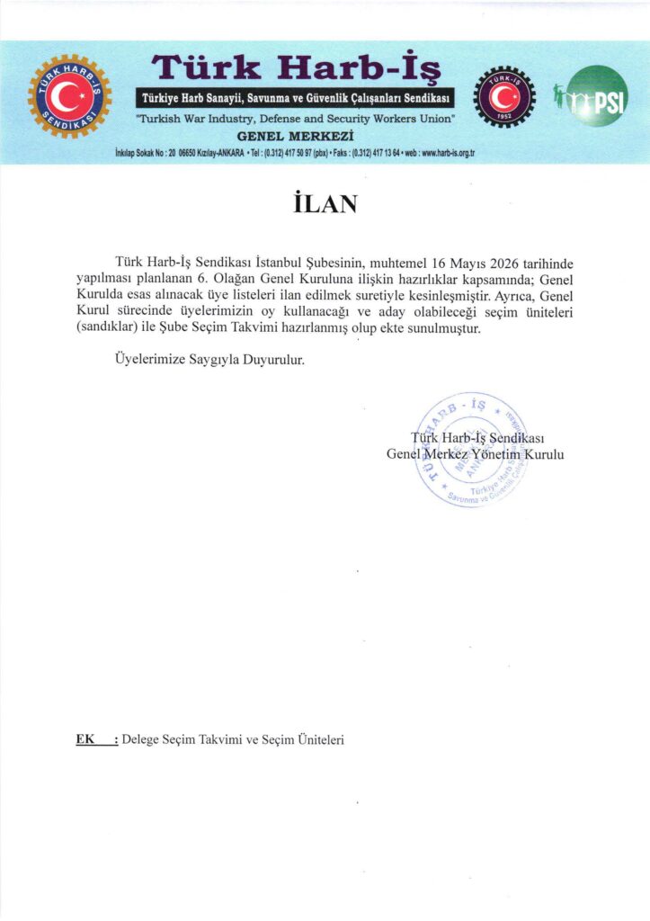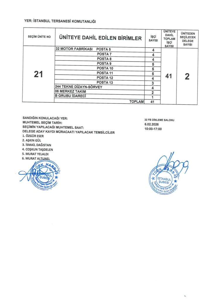 TÜRK HARB-İŞ SENDİKASI İSTANBUL ŞUBESİ DELEGE SEÇİMLERİNE YÖNELİK DUYURU VE ÜNİTE LİSTESİ