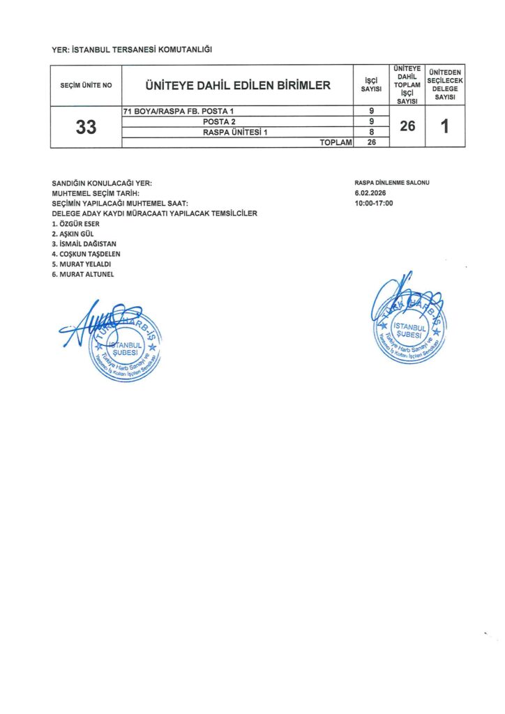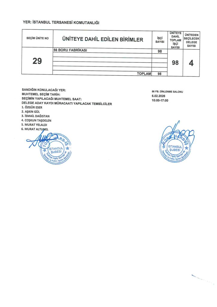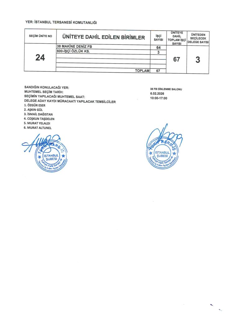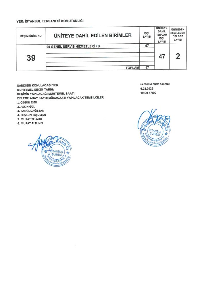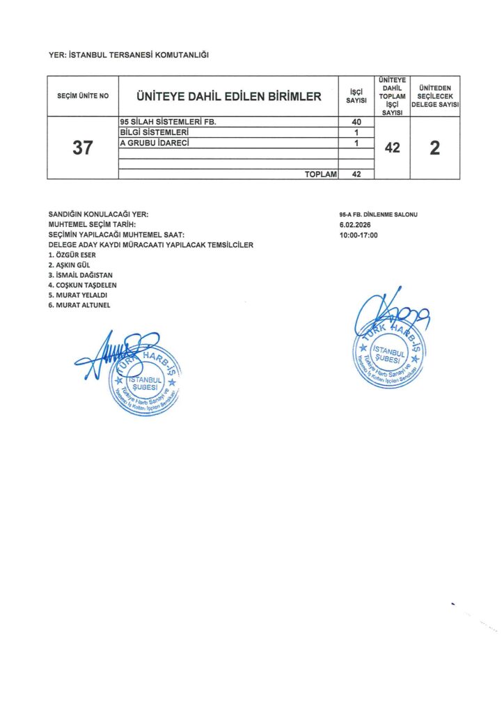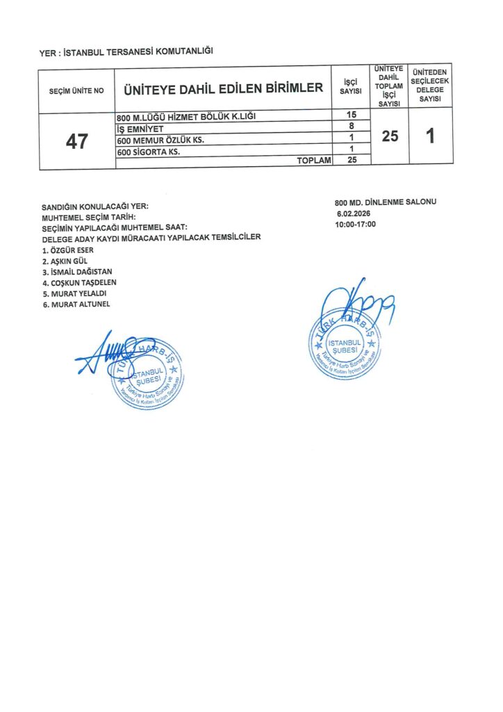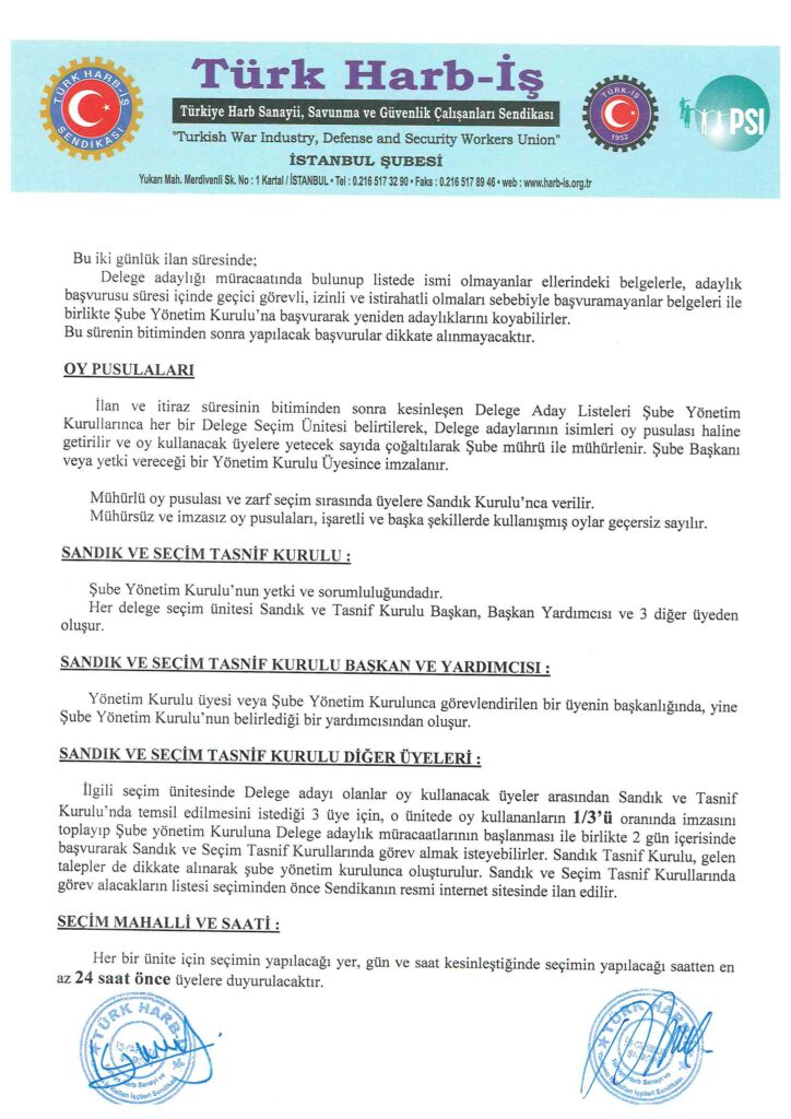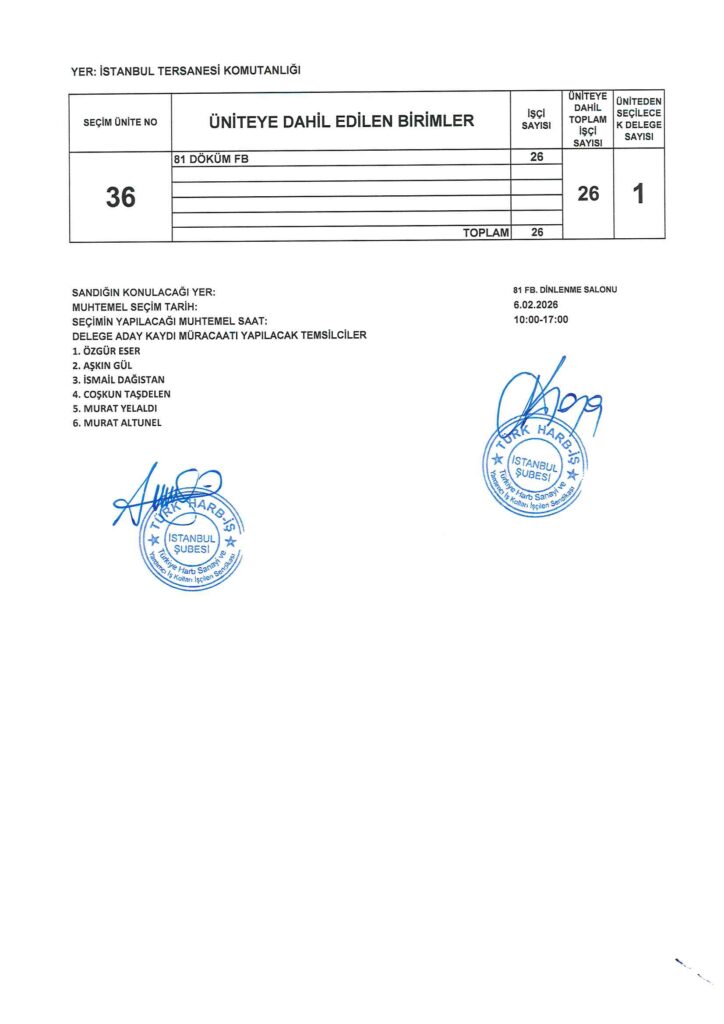 TÜRK HARB-İŞ SENDİKASI İSTANBUL ŞUBESİ DELEGE SEÇİMLERİNE YÖNELİK DUYURU VE ÜNİTE LİSTESİ