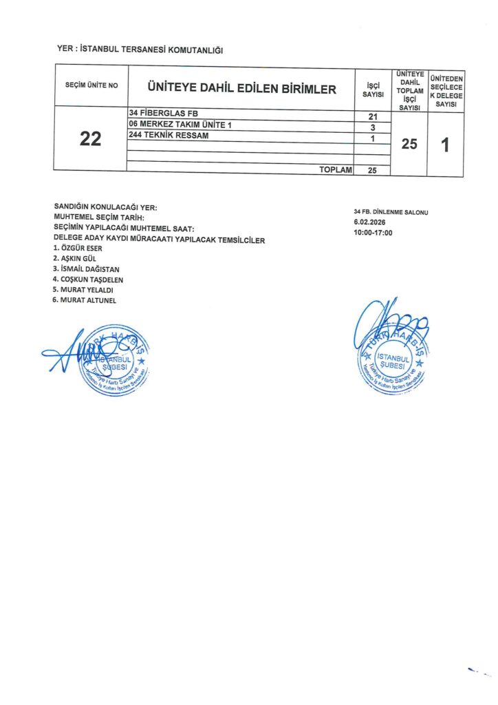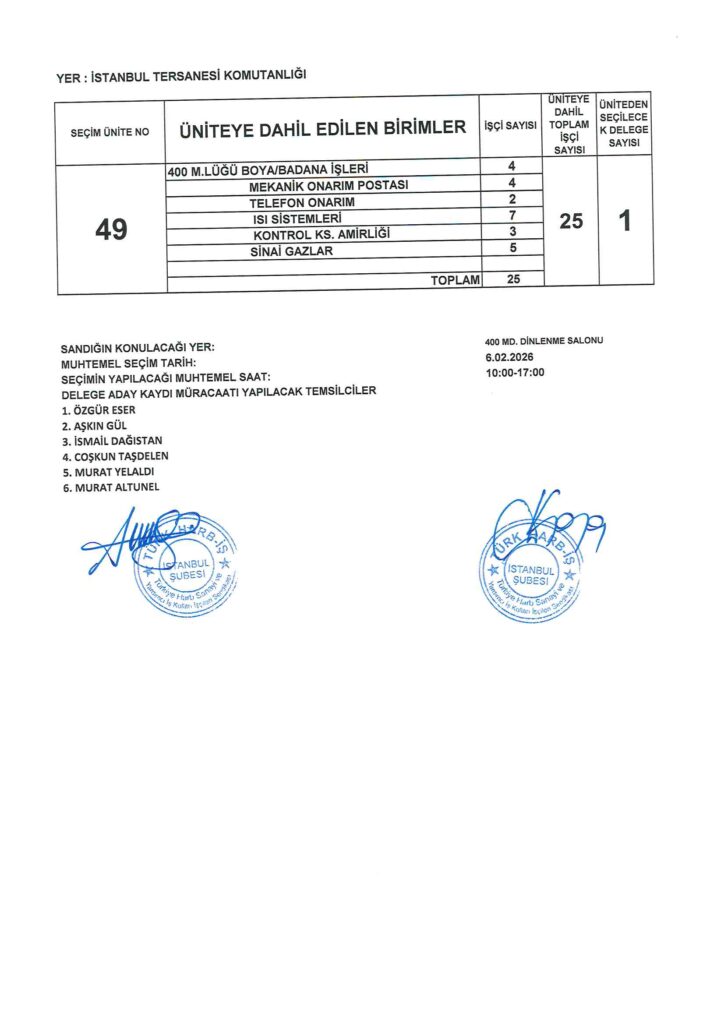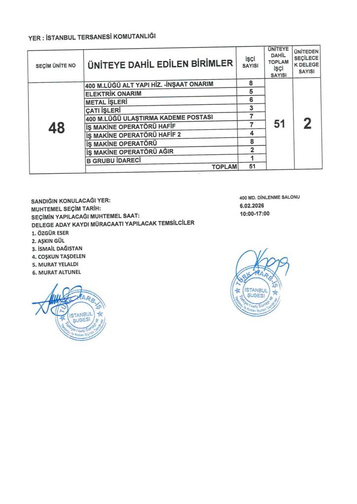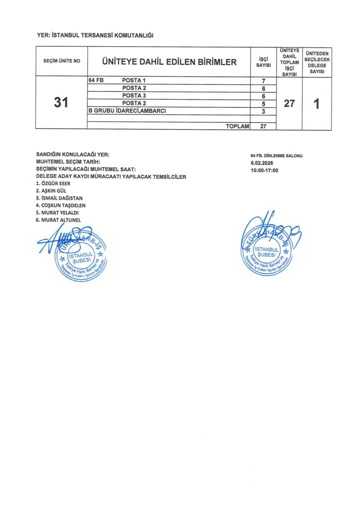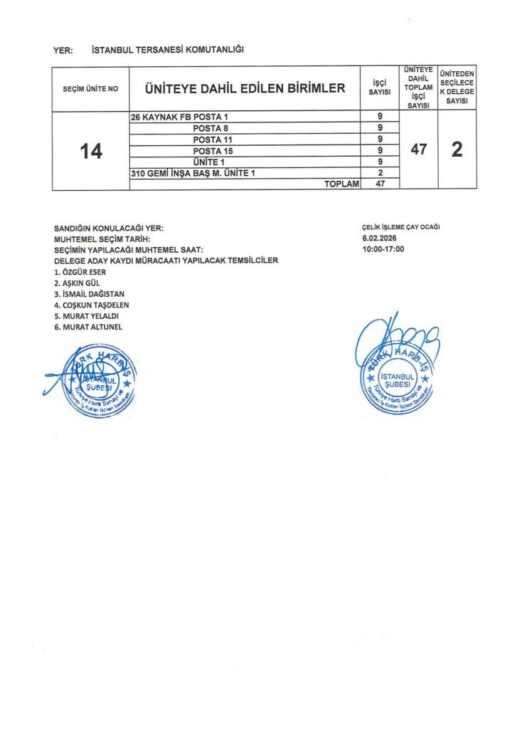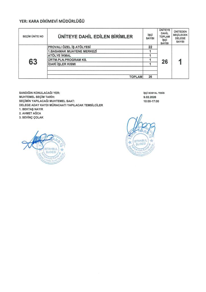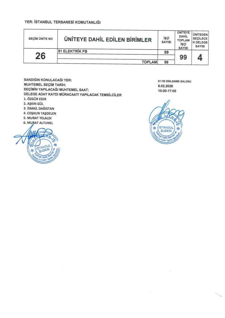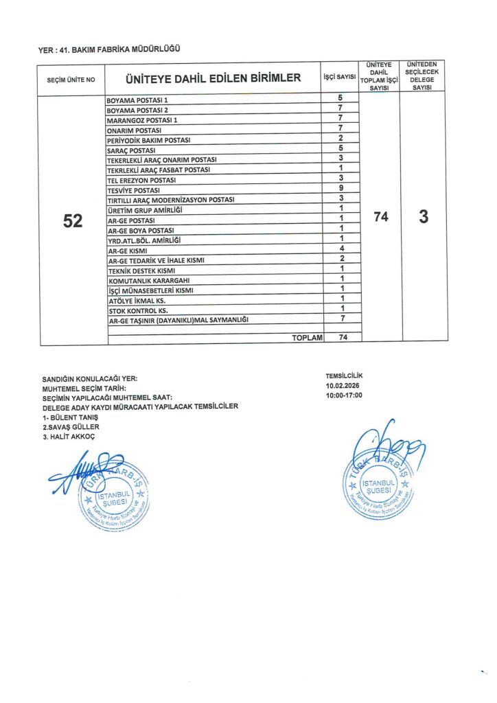 TÜRK HARB-İŞ SENDİKASI İSTANBUL ŞUBESİ DELEGE SEÇİMLERİNE YÖNELİK DUYURU VE ÜNİTE LİSTESİ