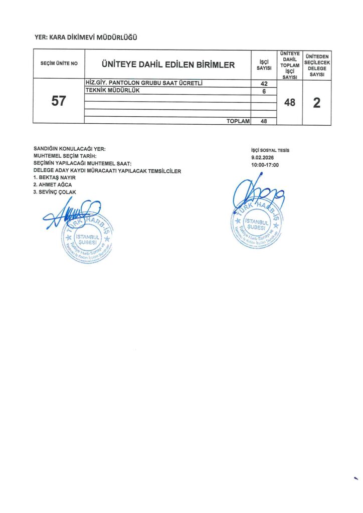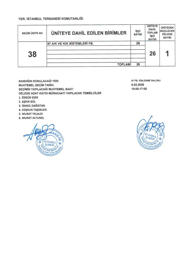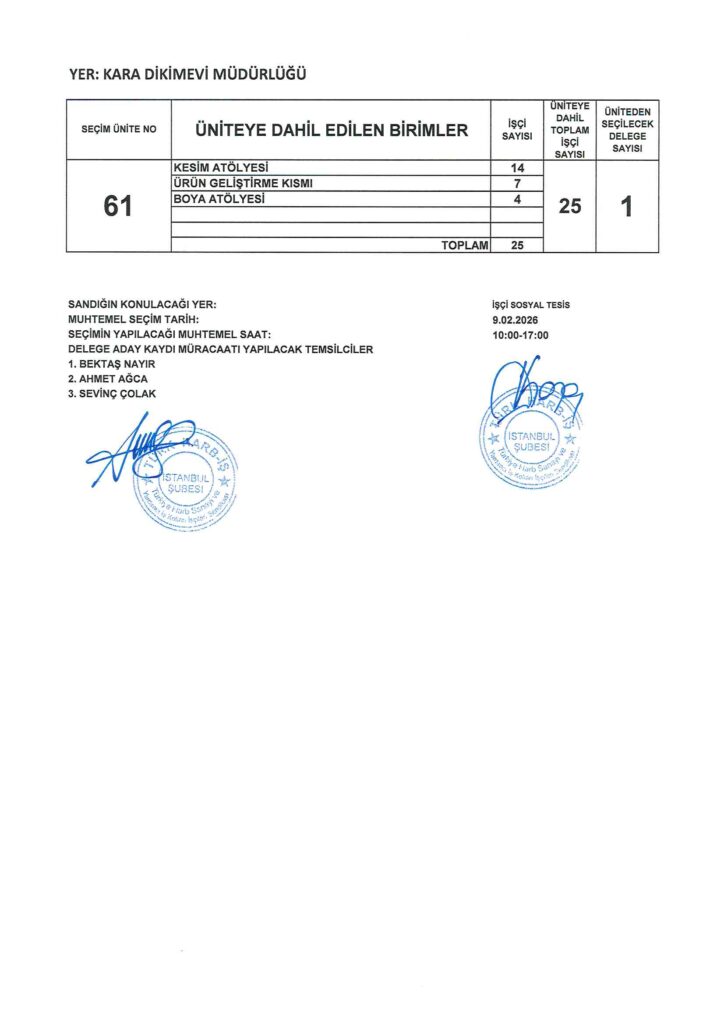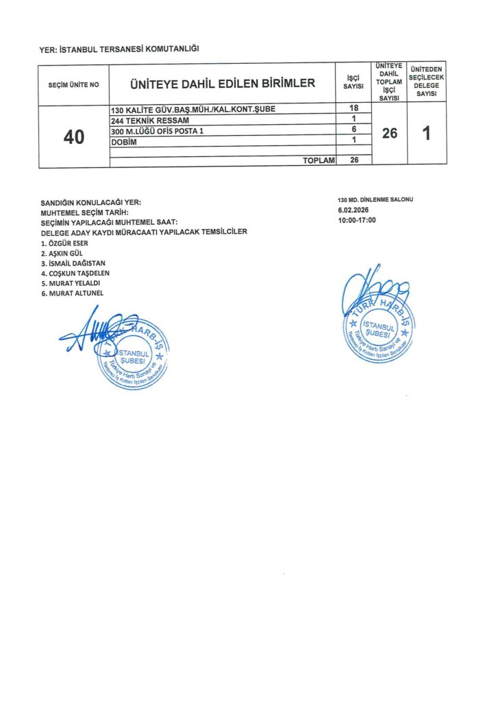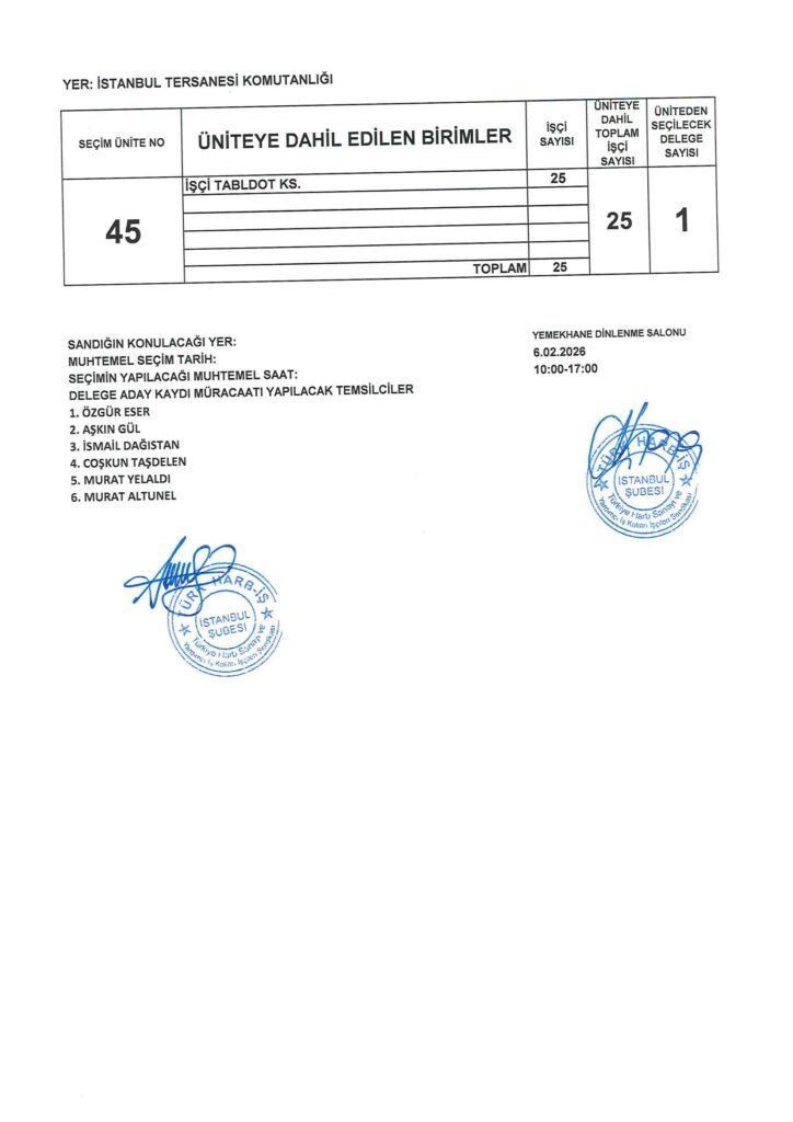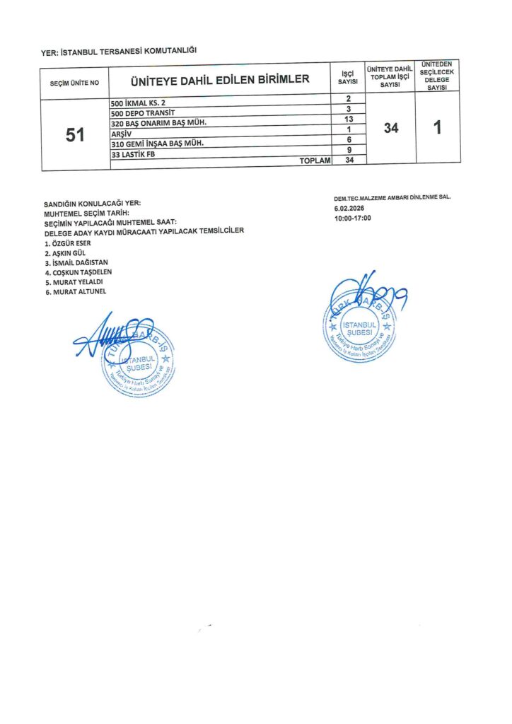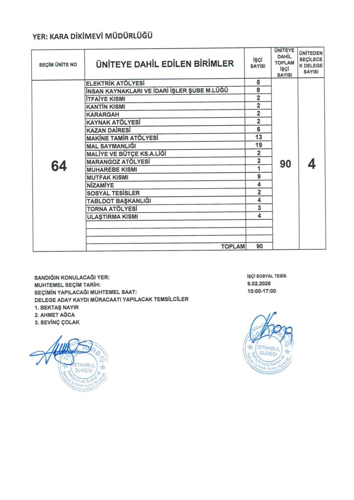 TÜRK HARB-İŞ SENDİKASI İSTANBUL ŞUBESİ DELEGE SEÇİMLERİNE YÖNELİK DUYURU VE ÜNİTE LİSTESİ