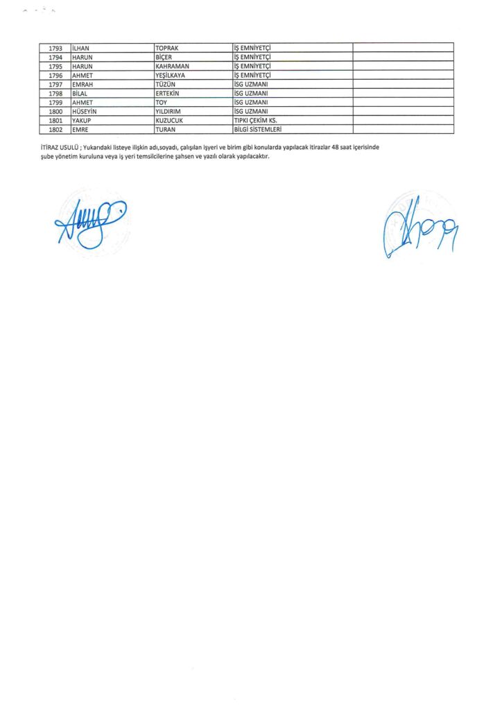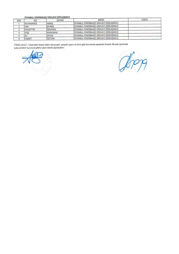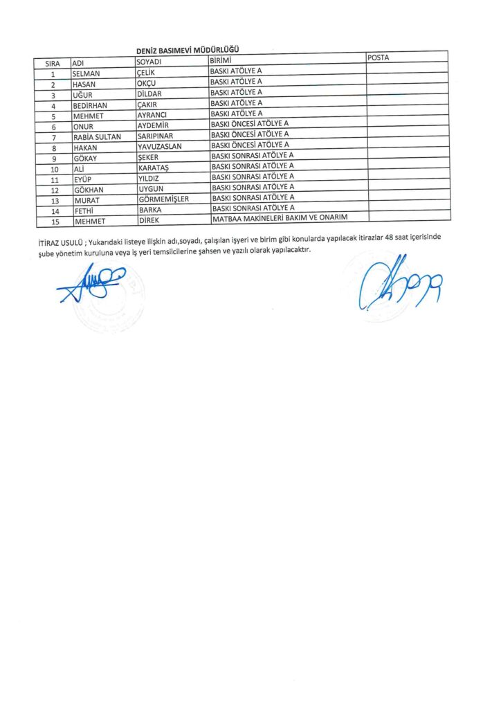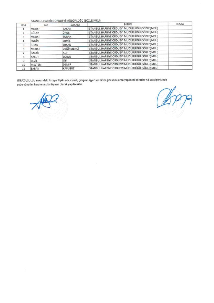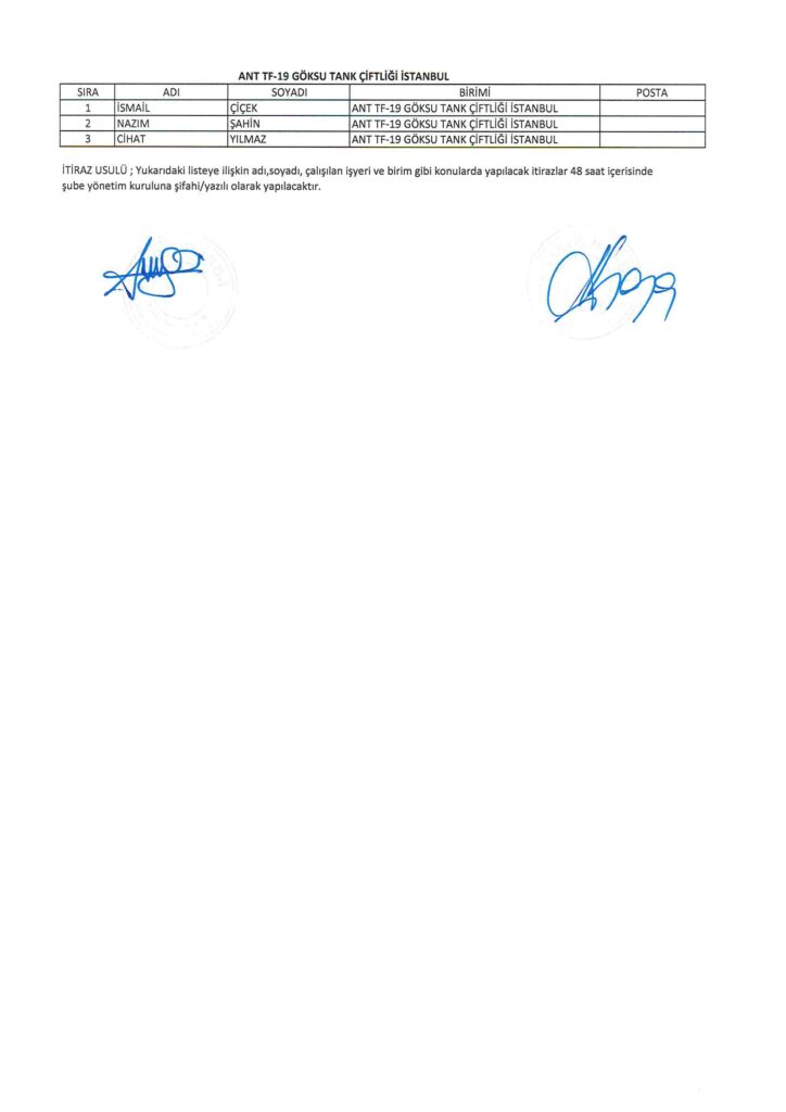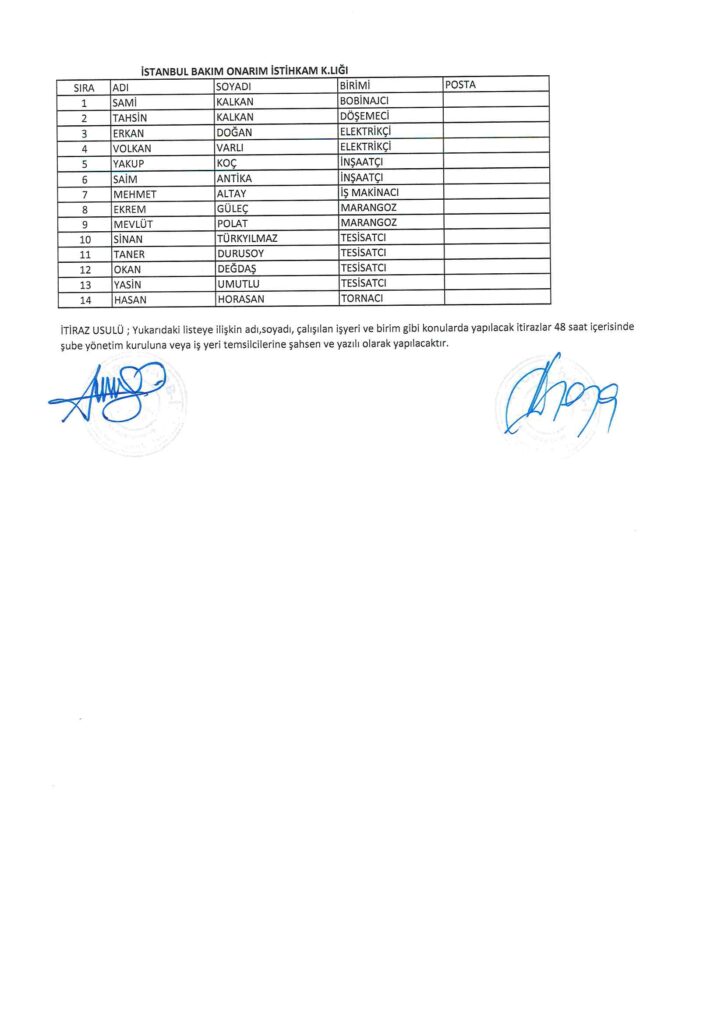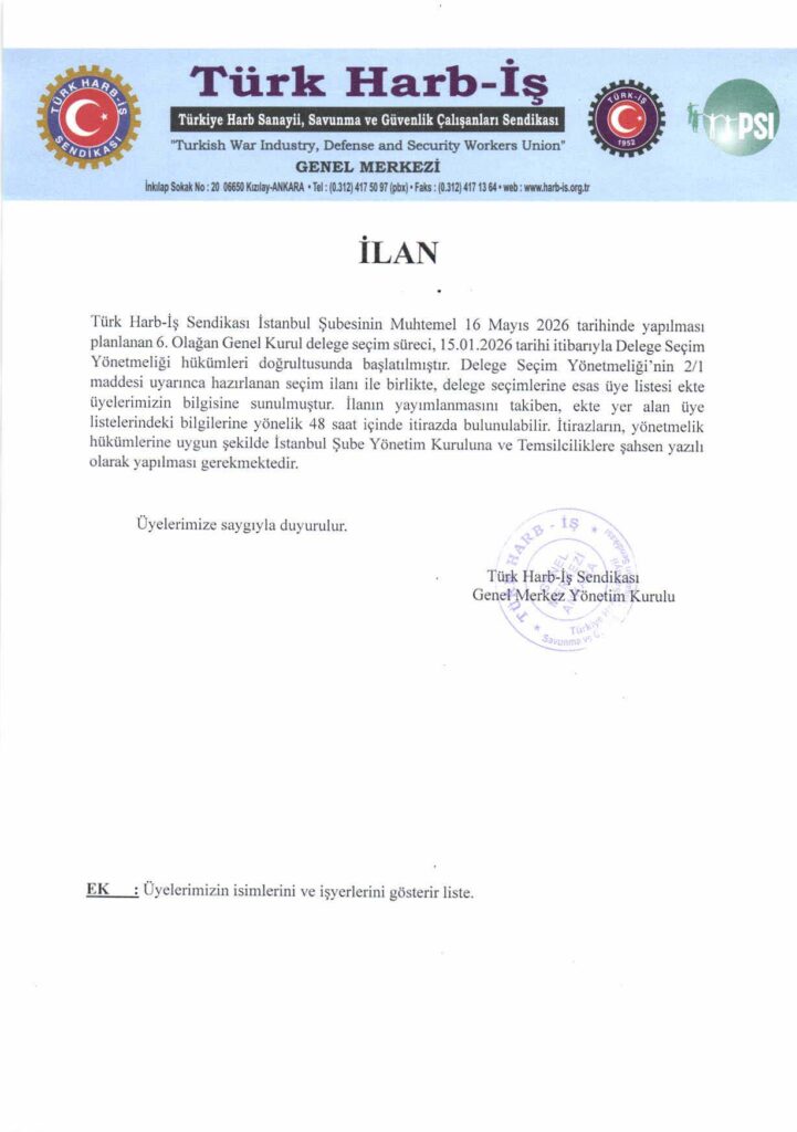 TÜRK HARB-İŞ SENDİKASI İSTANBUL ŞUBESİ DELEGE SEÇİMLERİNE YÖNELİK ÜYE LİSTESİ İLANI
